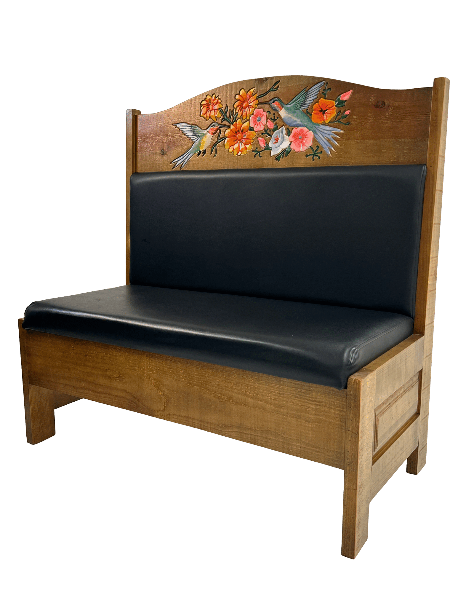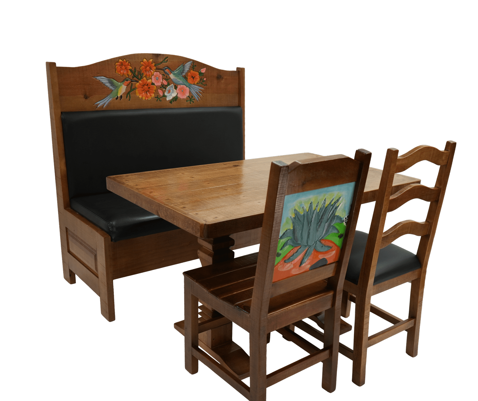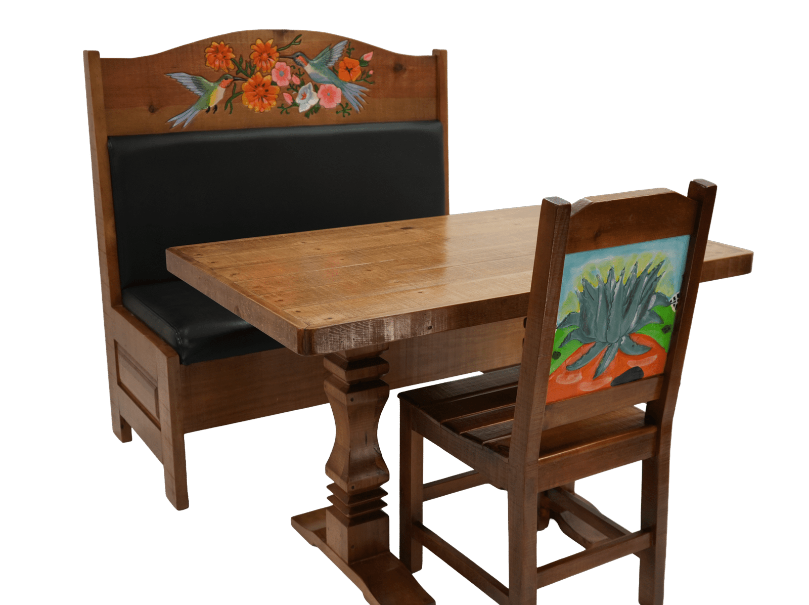 | Características generales | Hecho a mano por artesanos mexicanos, Butaca para mesa de 4 personas, Ideal para restaurantes, comedores temáticos y espacios con identidad propia, Diseño personalizable: logos, emblemas o ilustraciones, Asiento tapizado en vinil negro comercial, Muestra representativa del trabajo personalizado, Medidas aproximadas: 48" largo, 24" ancho, 50" alto |