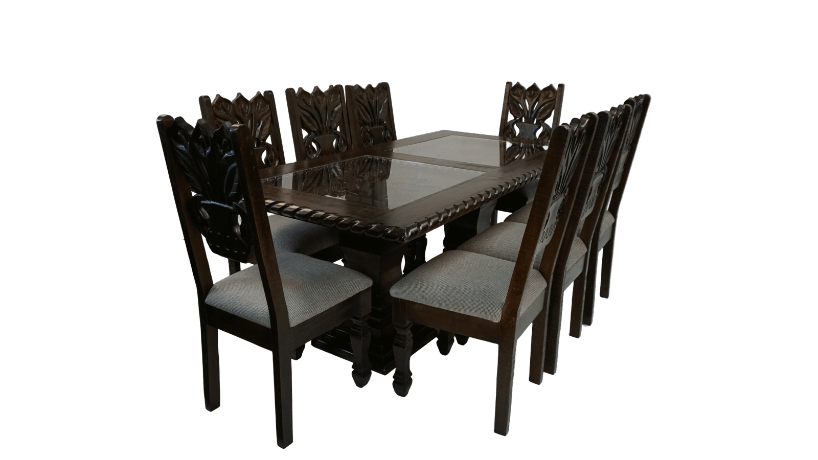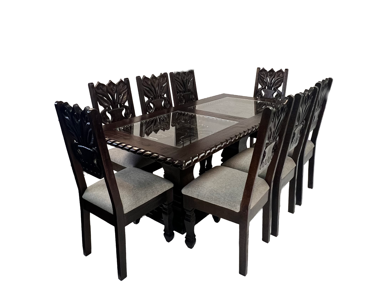 Juego de comedor artesanal con diseño de alcatraz, hecho 100% en madera sólida y tallado a mano. Disponible para 4, 6 u 8 sillas, con moldura de lazo, vidrios incluidos, sillas ensambladas desde fábrica y opción de tapizado. Acabado semimate en tonos: Early American, roble, chocolate o natural.