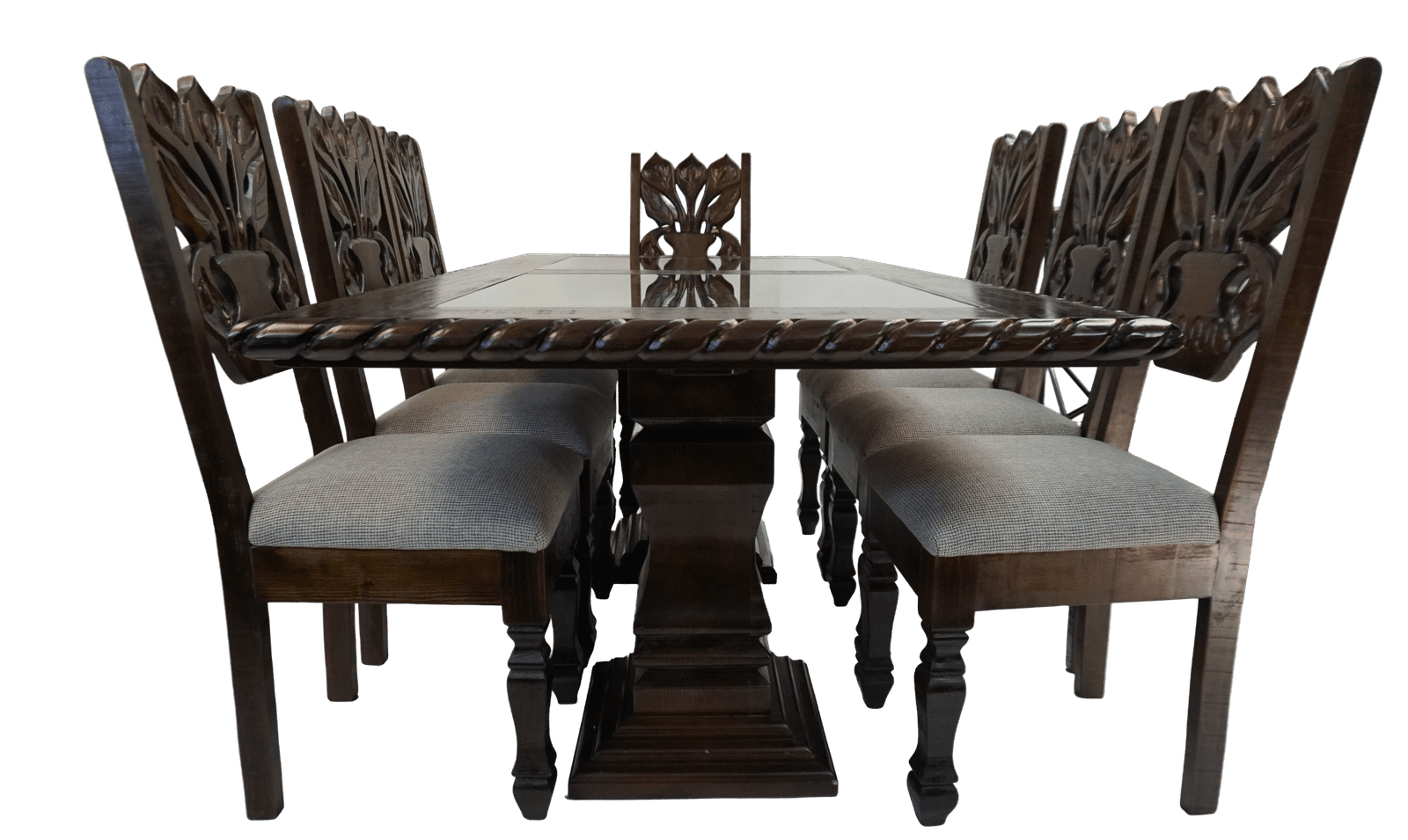 | Características generales | 100% madera sólida, Hecho a mano por artesanos mexicanos, Mesa rectangular, Disponible con pedestal o 4 patas, Incluye 2 vidrios protectores, Sillas ensambladas desde fábrica, Sillas con respaldo completo, Tapizado opcional en tela clara o vinil negro, Medidas aproximadas: 82" largo mesa, 43" ancho mesa, 32" alto mesa, 19½" largo silla, 18" ancho silla, 45" alto silla |