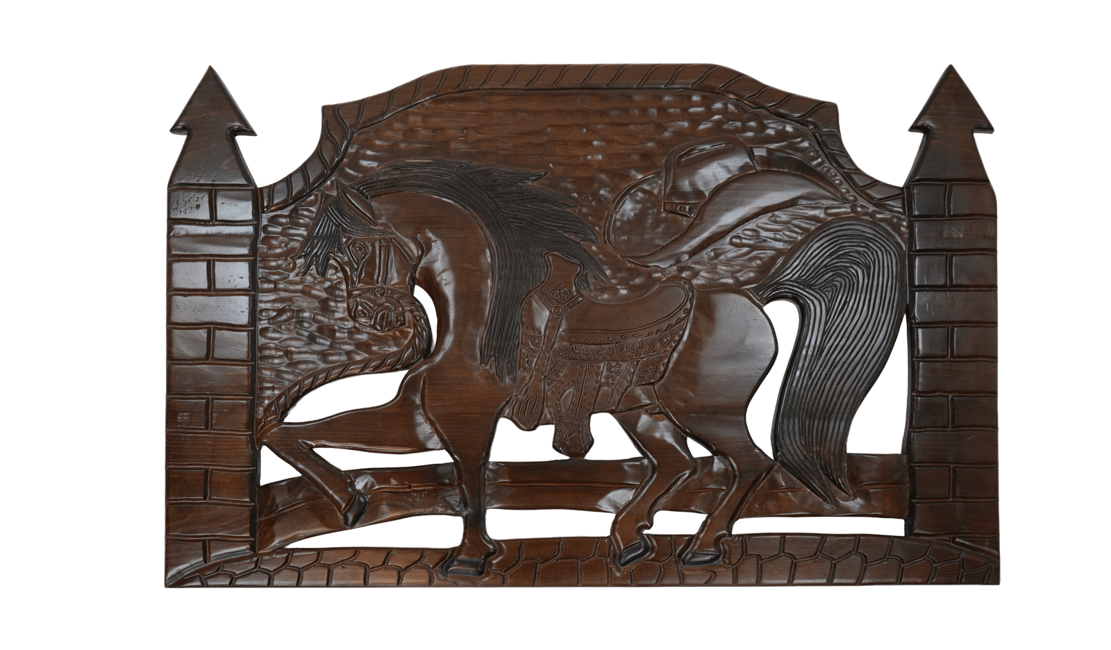 This hand-carved wooden artwork captures the essence of rustic Mexican art, featuring a saddled horse and a traditional hat—symbols of cultural heritage. The Early American finish enhances the natural wood grain, bringing warmth and personality to any space.