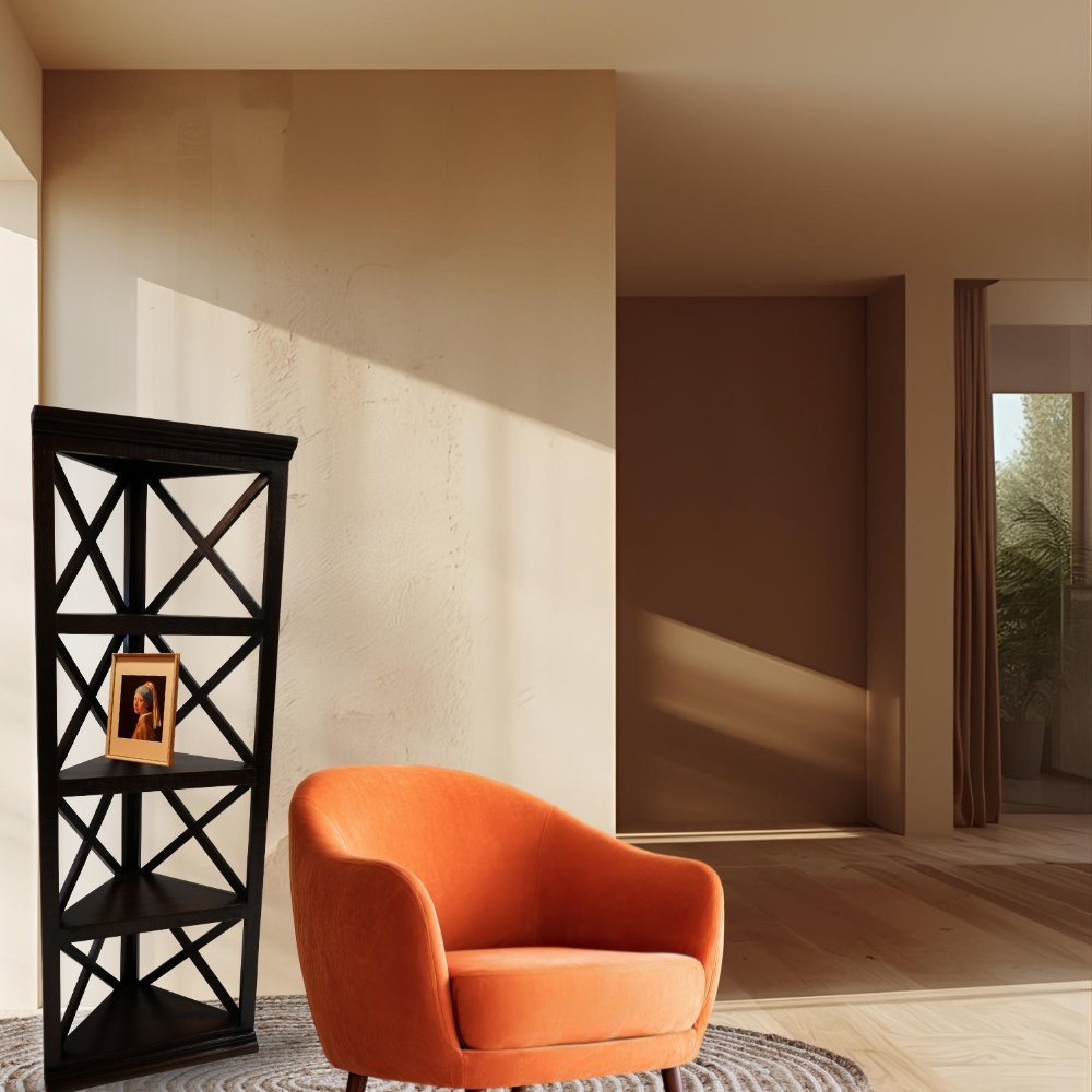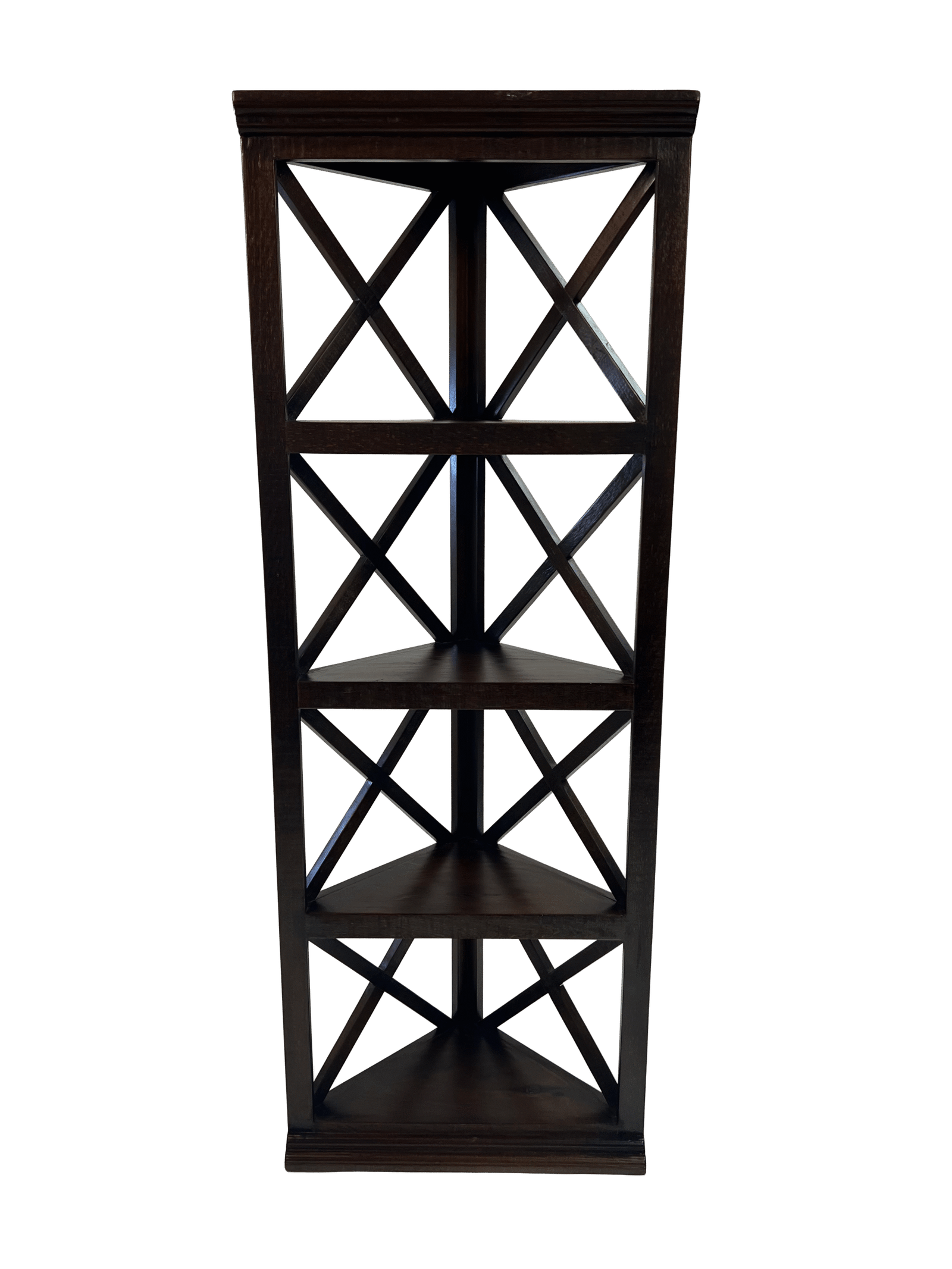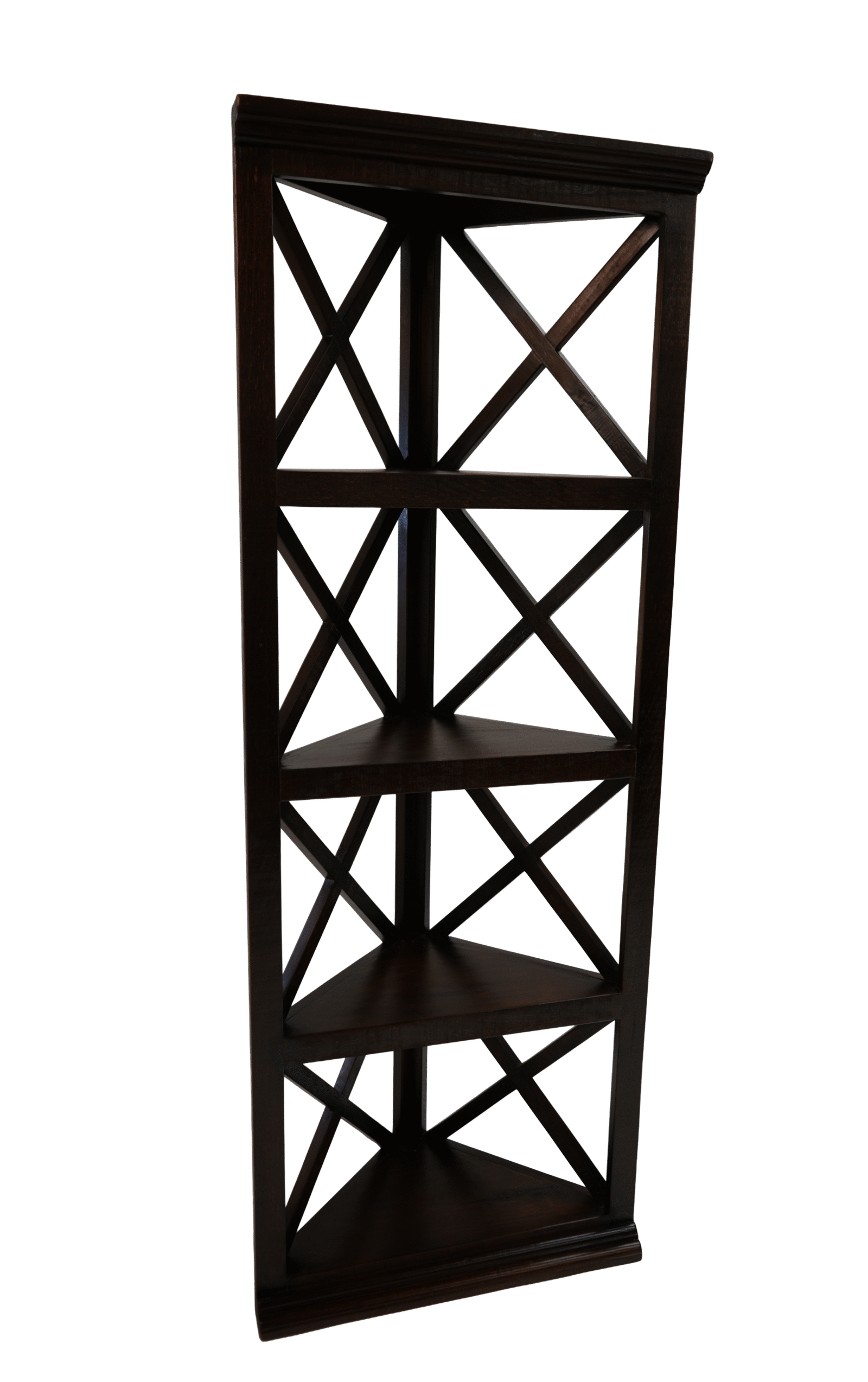 The “X” Rustic Wooden Corner Shelf blends functional elegance with handcrafted design. Made from solid wood, it features four open shelves supported by a stylish X-frame structure that enhances both strength and visual appeal.