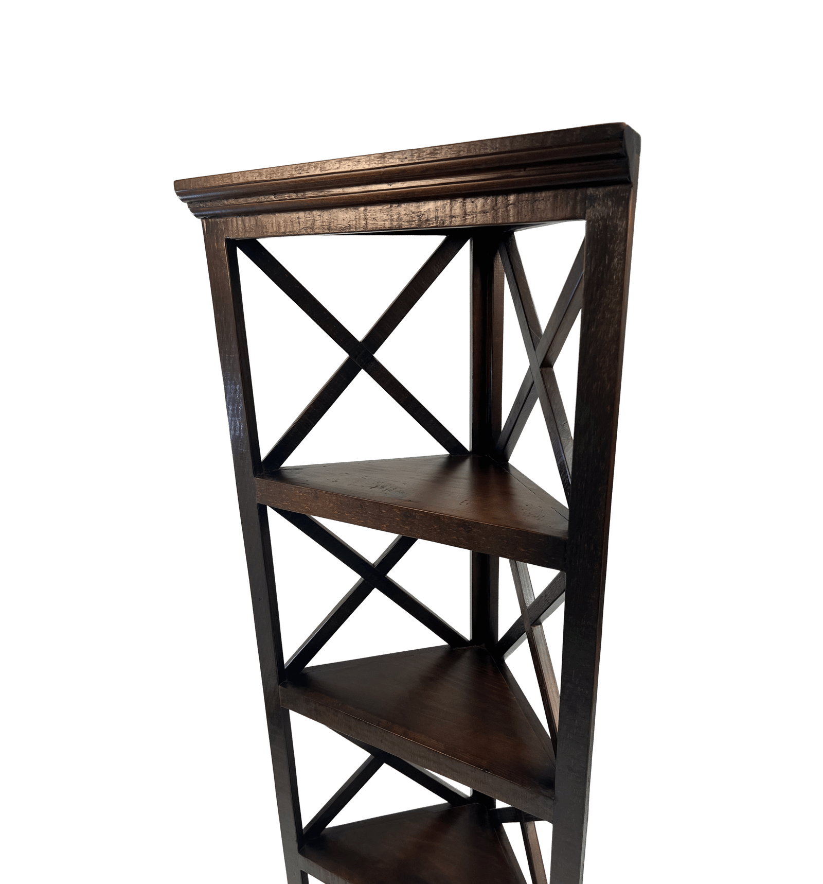 Elegante esquinero rústico de madera con cuatro estantes abiertos en diseño tipo “X”. Ideal para decorar y optimizar espacios con estilo, calidez y funcionalidad artesanal.