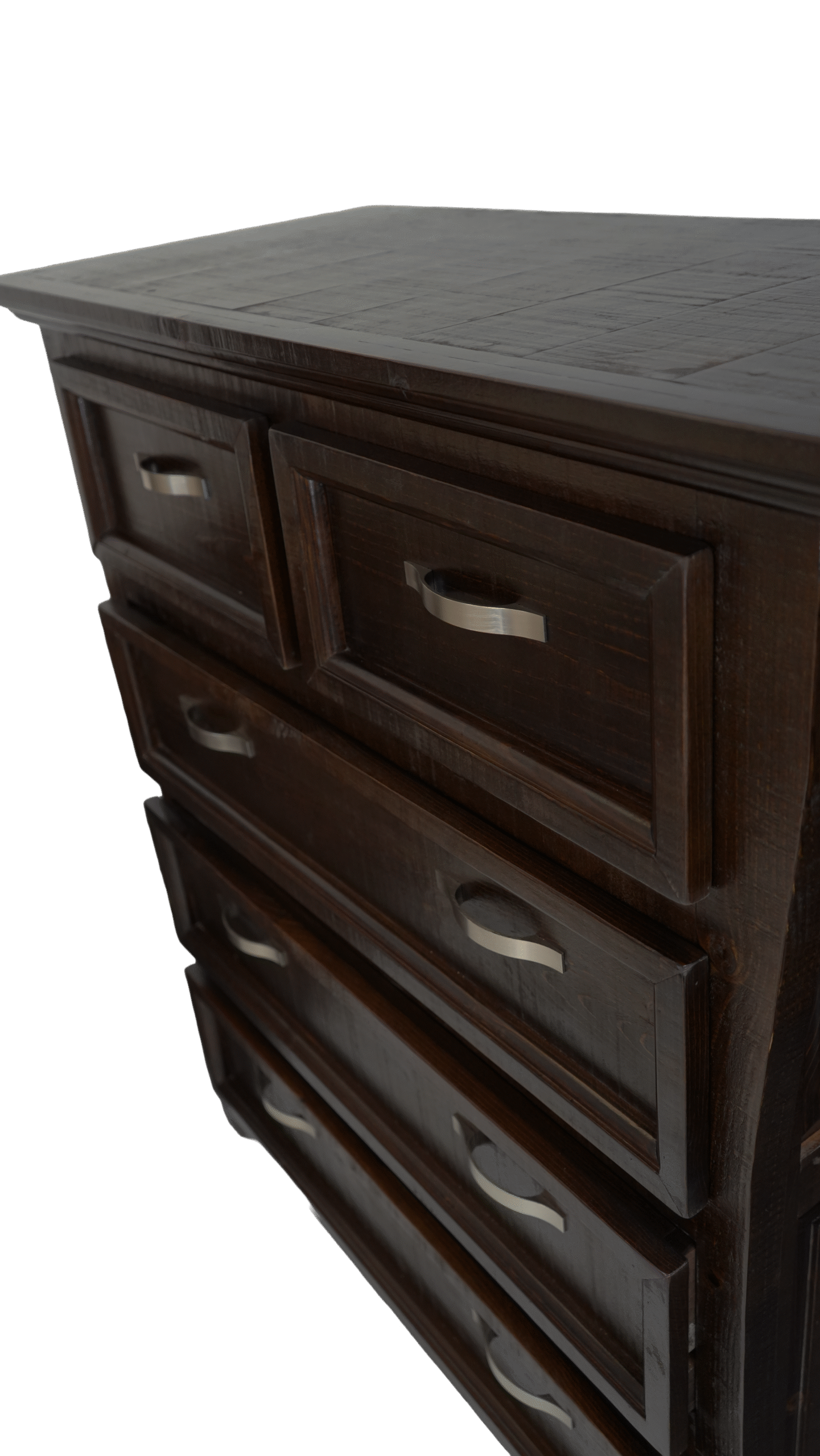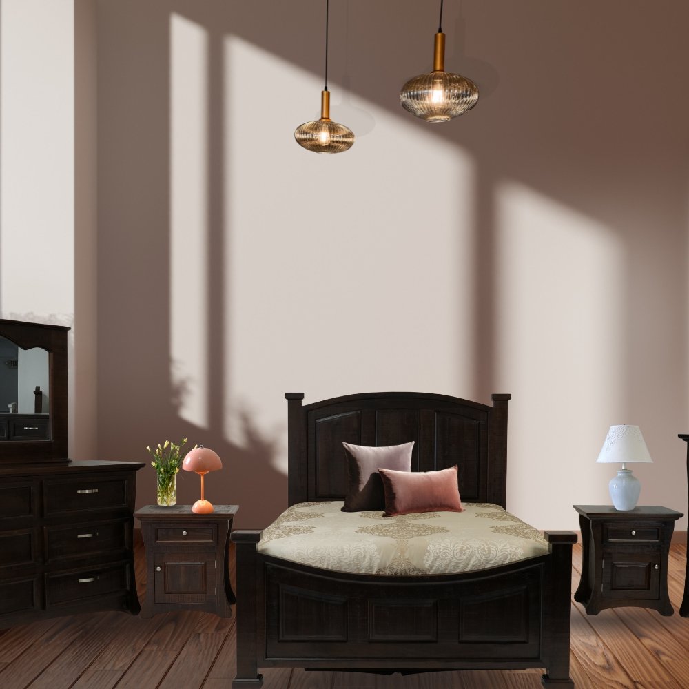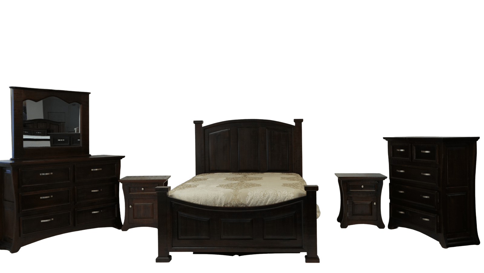 This complete set includes two nightstands, a dresser with mirror, a large chest of drawers, and a bed, designed to provide both comfort and visual harmony. Available in Full, Queen, and King sizes, and in two finishes: Early American, a classic warm tone, and Oak, a lighter and modern shade.