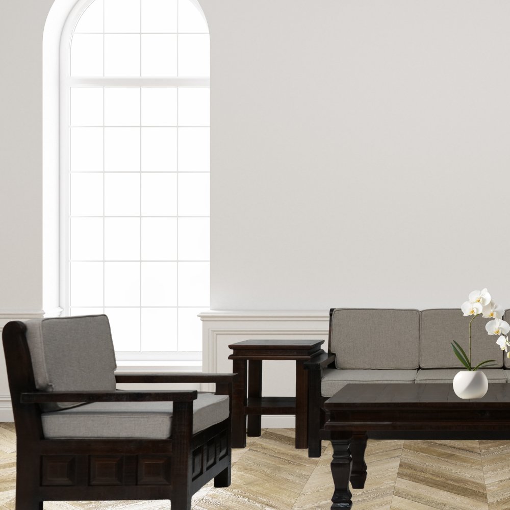 Compuesta por silla, love seat y sofá, su estructura está fabricada con madera sólida que garantiza durabilidad, mientras que los cojines removibles y lavables ofrecen practicidad y confort para el día a día.